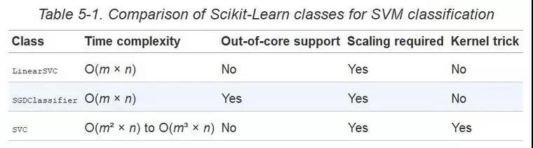 SVC 类基于libsvm库,它实现了支持核技巧的算法。训练时间复杂度通常介于O(m^2 × n)和O(m^3 × n)之间。不幸的是,这意味着当训练样本变大时,它将变得极其慢(例如,成千上万个样本)。这个算法对于复杂但小型或中等数量的数据集表现是完美的。然而,它能对特征数量很好的缩放,尤其对稀疏特征来说(sparse features)(即每个样本都有一些非零特征)。在这个情况下,算法对每个样本的非零特征的平均数量进行大概的缩放。表 5-1 对 Scikit-learn 的 SVM 分类模型进行比较。