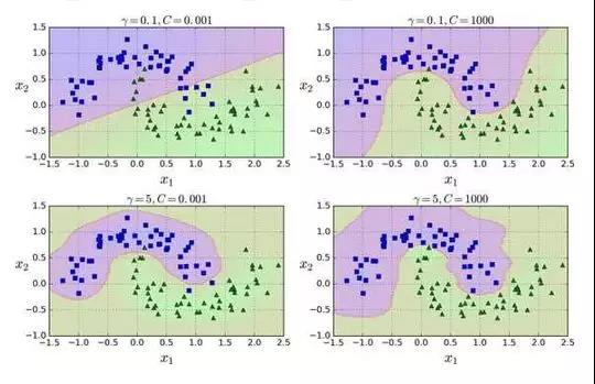 这个模型在图 5-9 的左下角表示。其他的图显示了用不同的超参数gamma (γ)和C训练的模型。增大γ使钟型曲线更窄(图 5-8 左图),导致每个样本的影响范围变得更小:即判定边界最终变得更不规则,在单个样本周围环绕。相反的,较小的γ值使钟型曲线更宽,样本有更大的影响范围,判定边界最终则更加平滑。所以γ是可调整的超参数:如果你的模型过拟合,你应该减小γ值,若欠拟合,则增大γ(与超参数C相似)。