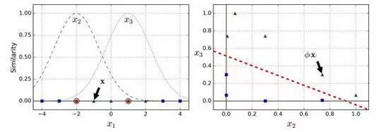 它是个从 0 到 1 的钟型函数,值为 0 的离地标很远,值为 1 的在地标上。现在我们准备计算新特征。例如,我们看一下样本x1=-1:它距离第一个地标距离是 1,距离第二个地标是 2。因此它的新特征为x2=exp((-0.3 × 1)^2)≈0.74和x3=exp((-0.3 × 2)^2)≈0.30。图 5-8 右边的图显示了特征转换后的数据集(删除了原始特征),正如你看到的,它现在是线性可分了。