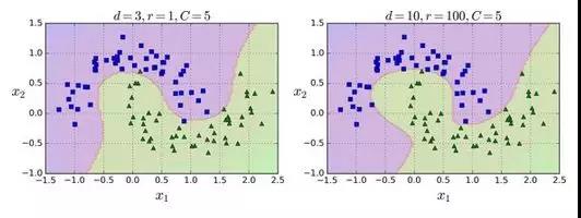 这段代码用3阶的多项式核训练了一个 SVM 分类器,即图 5-7 的左图。右图是使用了10阶的多项式核 SVM 分类器。很明显,如果你的模型过拟合,你可以减小多项式核的阶数。相反的,如果是欠拟合,你可以尝试增大它。超参数coef0控制了高阶多项式与低阶多项式对模型的影响。