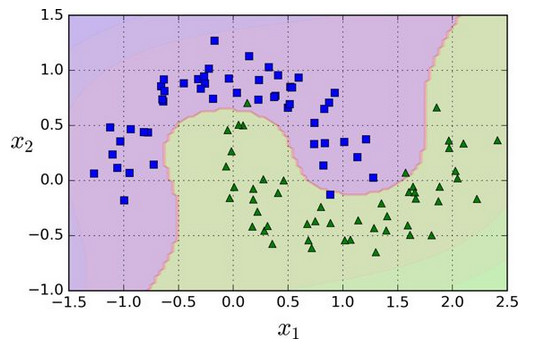 为了实施这个想法,通过 Scikit-Learn,你可以创建一个流水线(Pipeline)去包含多项式特征(PolynomialFeatures)变换(在 121 页的“Polynomial Regression”中讨论),然后一个StandardScaler和LinearSVC。让我们在卫星数据集(moons datasets)测试一下效果。