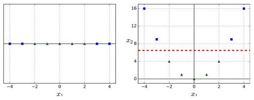 尽管线性 SVM 分类器在许多案例上表现得出乎意料的好,但是很多数据集并不是线性可分的。一种处理非线性数据集方法是增加更多的特征,例如多项式特征(正如你在第4章所做的那样);在某些情况下可以变成线性可分的数据。在图 5-5的左图中,它只有一个特征x1的简单的数据集,正如你看到的,该数据集不是线性可分的。但是如果你增加了第二个特征 x2=(x1)^2,产生的 2D 数据集就能很好的线性可分。
