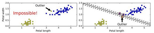 如果我们严格地规定所有的数据都不在“街道”上,都在正确地两边,称为硬间隔分类,硬间隔分类有两个问题,第一,只对线性可分的数据起作用,第二,对异常点敏感。图 5-3 显示了只有一个异常点的鸢尾花数据集:左边的图中很难找到硬间隔,右边的图中判定边界和我们之前在图 5-1 中没有异常点的判定边界非常不一样,它很难一般化。