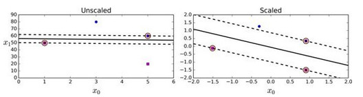 SVM 对特征缩放比较敏感,可以看到图 5-2:左边的图中,垂直的比例要更大于水平的比例,所以最宽的“街道”接近水平。但对特征缩放后(例如使用Scikit-Learn的StandardScaler),判定边界看起来要好得多,如右图。