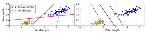 SVM 的基本思想能够用一些图片来解释得很好,图 5-1 展示了我们在第4章结尾处介绍的鸢尾花数据集的一部分。这两个种类能够被非常清晰,非常容易的用一条直线分开(即线性可分的)。左边的图显示了三种可能的线性分类器的判定边界。其中用虚线表示的线性模型判定边界很差,甚至不能正确地划分类别。另外两个线性模型在这个数据集表现的很好,但是它们的判定边界很靠近样本点,在新的数据上可能不会表现的很好。相比之下,右边图中 SVM 分类器的判定边界实线,不仅分开了两种类别,而且还尽可能地远离了最靠近的训练数据点。你可以认为 SVM 分类器在两种类别之间保持了一条尽可能宽敞的街道(图中平行的虚线),其被称为最大间隔分类。