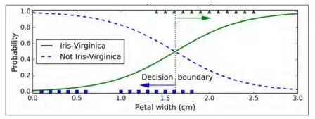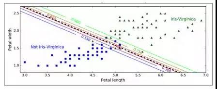 Virginica 花的花瓣宽度(用三角形表示)在 1.4 厘米到 2.5 厘米之间,而其他种类的花(由正方形表示)通常具有较小的花瓣宽度,范围从 0.1 厘米到 1.8 厘米。注意,它们之间会有一些重叠。在大约 2 厘米以上时,分类器非常肯定这朵花是Virginica花(分类器此时输出一个非常高的概率值),而在1厘米以下时,它非常肯定这朵花不是 Virginica 花(不是 Virginica 花有非常高的概率)。在这两个极端之间,分类器是不确定的。但是,如果你使用它进行预测(使用predict()方法而不是predict_proba()方法),它将返回一个最可能的结果。因此,在 1.6 厘米左右存在一个决策边界,这时两类情况出现的概率都等于 50%:如果花瓣宽度大于 1.6 厘米,则分类器将预测该花是 Virginica,否则预测它不是(即使它有可能错了):