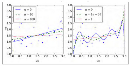 图 4-17 展示了在相同线性数据上使用不同 $\alpha$ 值的岭回归模型最后的表现。左图中,使用简单的岭回归模型,最后得到了线性的预测。右图中的数据首先使用 10 阶的PolynomialFearures进行扩展,然后使用StandardScaler进行缩放,最后将岭模型应用在处理过后的特征上。这就是带有岭正则项的多项式回归。注意当$\alpha$增大的时候,导致预测曲线变得扁平(即少了极端值,多了一般值),这样减少了模型的方差,却增加了模型的偏差。