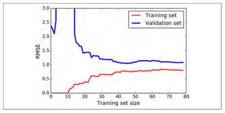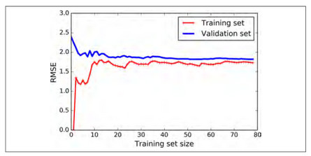 这幅图值得我们深究。首先,我们观察训练集的表现:当训练集只有一两个样本的时候,模型能够非常好的拟合它们,这也是为什么曲线是从零开始的原因。但是当加入了一些新的样本的时候,训练集上的拟合程度变得难以接受,出现这种情况有两个原因,一是因为数据中含有噪声,另一个是数据根本不是线性的。因此随着数据规模的增大,误差也会一直增大,直到达到高原地带并趋于稳定,在之后,继续加入新的样本,模型的平均误差不会变得更好或者更差。我们继续来看模型在验证集上的表现,当以非常少的样本去训练时,模型不能恰当的泛化,也就是为什么验证误差一开始是非常大的。当训练样本变多的到时候,模型学习的东西变多,验证误差开始缓慢的下降。但是一条直线不可能很好的拟合这些数据,因此最后误差会到达在一个高原地带并趋于稳定,最后和训练集的曲线非常接近。