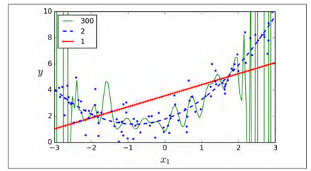 如果你使用一个高阶的多项式回归,你可能发现它的拟合程度要比普通的线性回归要好的多。例如,图 4-14 使用一个 300 阶的多项式模型去拟合之前的数据集,并同简单线性回归、2 阶的多项式回归进行比较。注意 300 阶的多项式模型如何摆动以尽可能接近训练实例。