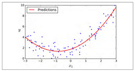 请注意,当存在多个特征时,多项式回归能够找出特征之间的关系(这是普通线性回归模型无法做到的)。 这是因为LinearRegression会自动添加当前阶数下特征的所有组合。例如,如果有两个特征 $a,b$,使用 3 阶(degree=3)的LinearRegression时,不仅有 $a^2,a^3,b^2$ 以及 $b^3$,同时也会有它们的其他组合项 $ab,a^2b,ab^2$。