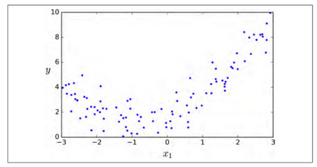如果你的数据实际上比简单的直线更复杂呢? 令人惊讶的是,你依然可以使用线性模型来拟合非线性数据。 一个简单的方法是对每个特征进行加权后作为新的特征,然后训练一个线性模型在这个扩展的特征集。 这种方法称为多项式回归。