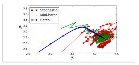 小批量梯度下降在参数空间上的表现比随机梯度下降要好的多,尤其在有大量的小型实例集时。作为结果,小批量梯度下降会比随机梯度更靠近最小值。但是,另一方面,它有可能陷在局部最小值中(在遇到局部最小值问题的情况下,和我们之前看到的线性回归不一样)。 图4-11显示了训练期间三种梯度下降算法在参数空间中所采用的路径。 他们都接近最小值,但批量梯度的路径最后停在了最小值,而随机梯度和小批量梯度最后都在最小值附近摆动。 但是,不要忘记,批次梯度需要花费大量时间来完成每一步,但是,如果你使用了一个较好的learning schedule,随机梯度和小批量梯度也可以得到最小值。