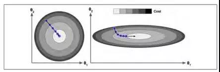 正如你看到的,左面的梯度下降可以直接快速地到达最小值,然而在右面的梯度下降第一次前进的方向几乎和全局最小值的方向垂直,并且最后到达一个几乎平坦的山谷,在平坦的山谷走了很长时间。它最终会达到最小值,但它需要很长时间。