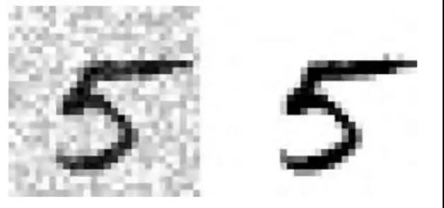 左边的加噪声的输入图片。右边是干净的目标图片。现在我们训练分类器,让它清洁这张图片: