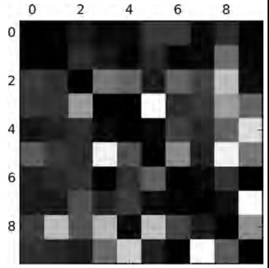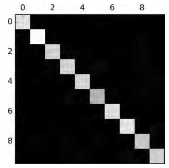 这里是一对数字。使用 Matplotlib 的matshow()函数,将混淆矩阵以图像的方式呈现,将会更加方便。