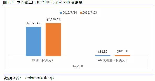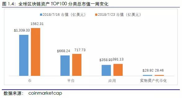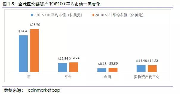 币类项目总体市值和平均市值涨幅最大。2018年7月23日,全球区块链资产TOP100项目中,币类项目本周总市值为1562.31亿美元,较上周上涨16.65%,涨幅最大。此外,币类项目本周平均市值为86.79亿美元,较上周上涨16.65%,涨幅最大。