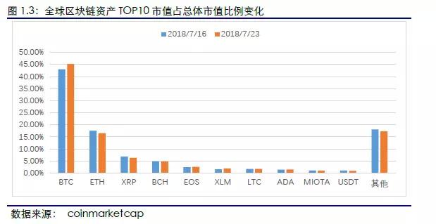 TOP10项目市值占比较稳定,10个项目中有9个项目市值有不同程度上涨。7月23日,TOP10资产项目市值为2,330.73亿美元,较上周上涨13.53%,占区块链资产总市值比例为82.66%,与上周持平。TOP10资产市值有9个项目上涨,其中ADA涨幅最大,为21.94%,USDT下跌2.05%。BTC本周市值占比45.21%,较上周上升2.13%。