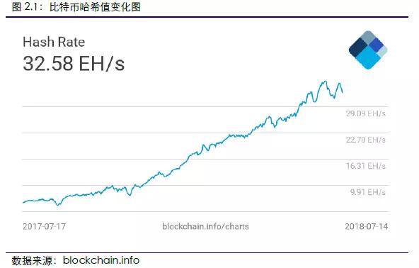本周比特币算力环比上升、以太坊算力环比下降。2018年7月16日至7月22日,比特币全网哈希值平均值为36.86EH/s,相比上周环比上升13.13%。