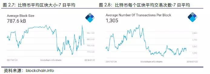 本周比特币区块大小、区块平均交易数均下降;以太坊的区块平均交易数、区块大小均上升。根据blockchain.info数据计算,2018年7月16日至7月22日,比特币本周每个区块的平均大小为787.6Kbs,与上周环比下降25.4%,每个区块的平均交易次数为1305次,与上周环比下降9.2%。