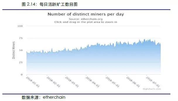 以太坊本周平均活跃矿工数目小幅下降。2018年7月16日至7月22日,以太坊平均活跃矿工数为62.57,相比上周平均数(66)下降5.2%。