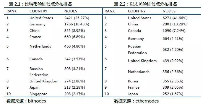 比特币节点数略有增加、以太坊节点数略有减少。截止2018年7月23日,比特币验证节点达到9581个,比上周增加1.48%,其中美国有2421个节点,占比25.27%,德国有1766个节点,占比18.43%,中国有855个节点,占比8.92%。