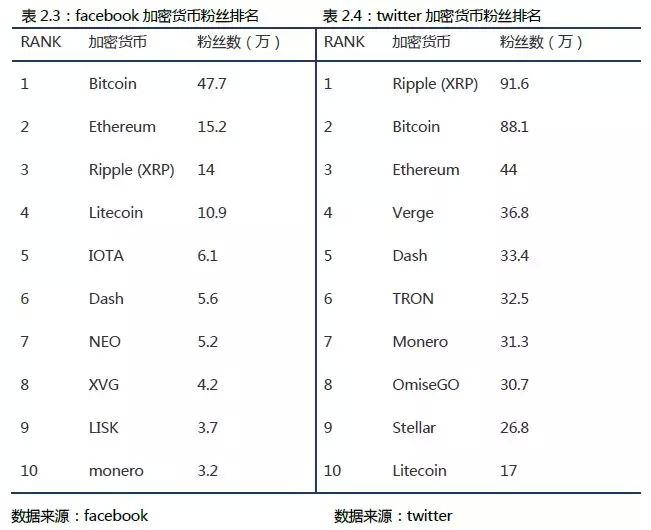截止2018年7月23日,facebook中Bitcoin 、Ethereum和Ripple (XRP)的公共主页关注数分列前三,分别拥有47.7万、15.2万和14万粉丝。Twitter中,粉丝数前三的项目为Ripple (XRP)、Bitcoin和Ethereum,粉丝数为91.6万、88.1万和44万。