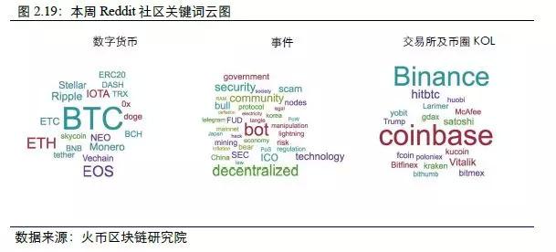 根据火币区块链大数据周度数据洞察报告,本周Reddit论坛关键词云图中,比特币、Bot(机器人)和Coinbase分别为数字货币、热点事件和交易所及币圈KOL领域的热度最高词汇。火币研究院基于国外最大的论坛Reddit中“虚拟货币(Crypto Currency)”类的发帖和回复统计了“数字货币”、“事件”和“交易所及KOL”三大类关键词。