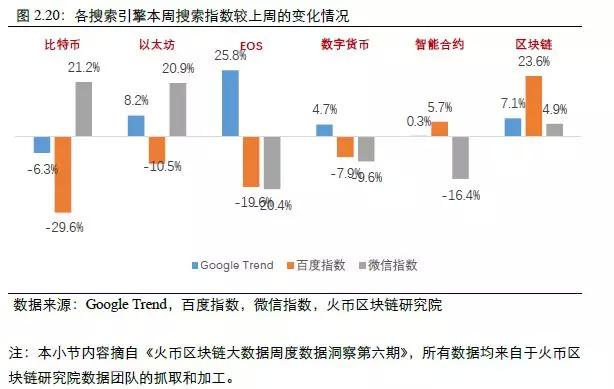 本周百度搜索上比特币/以太坊/EOS/数字货币的搜索量较上周均有所下降,但数字货币和智能合约的搜索量却有所上升;Google Trend本周与EOS的搜索量比上周大幅上升,其余变化不大;微信指数比特币和以太坊的热度较上周有上升。从话题来看,区块链的搜索量在三大引擎的搜索量均有所上升。