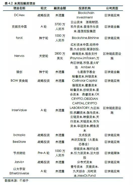 本周共统计12笔区块链行业的投融资项目,投资热度较上周无明显变化。其中,Nervos获得红杉资本中国,经纬中国,九合创投,策源创投,峰瑞资本,现在支付iPaynow,imToken,万向区块链,币信,星火矿池 Amber AI 等机构2800万美元天使轮投资,为本周最大单笔融资项目。另外,克班克中国获得云山资本,浙商财团,玖牛资本,香港乐仕资本,逸信控股集团等机构3700万人民币A轮融资。