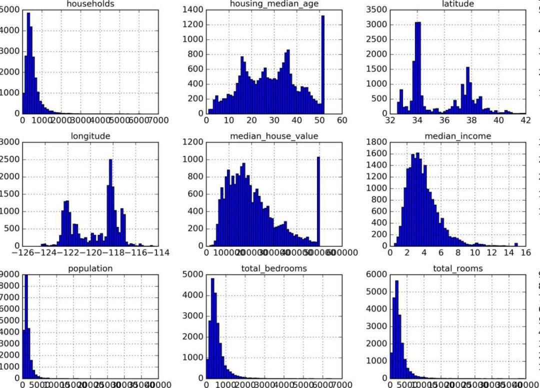每一行都表示一个街区。共有 10 个属性(截图中可以看到 6 个):经度、维度、房屋年龄中位数、总房间数、总卧室数、人口数、家庭数、收入中位数、房屋价值中位数、离大海距离。