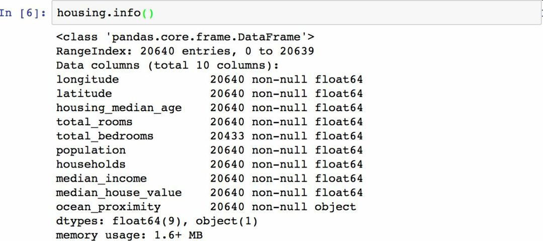 info()方法可以快速查看数据的描述,特别是总行数、每个属性的类型和非空值的数量(见图 2-6)。