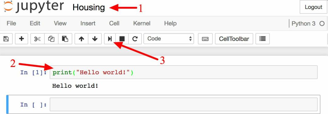 notebook 包含一组代码框。每个代码框可以放入可执行代码或格式化文本。现在,notebook 只有一个空的代码框,标签是In [1]:。在框中输入print("Hello world!"),点击运行按钮(见图 2-4)或按Shift+Enter。这会将当前的代码框发送到 Python 内核,运行之后会返回输出。结果显示在代码框下方。由于抵达了 notebook 的底部,一个新的代码框会被自动创建出来。从 Jupyter 的 Help 菜单中的 User Interface Tour,可以学习 Jupyter 的基本操作。
