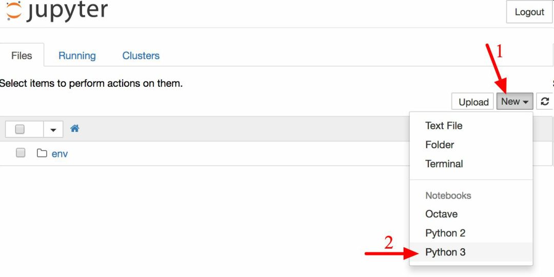 Jupyter 服务器现在运行在终端上,监听 888 8端口。你可以用浏览器打开http://localhost:8888/,以访问这个服务器(服务器启动时,通常就自动打开了)。你可以看到一个空的工作空间目录(如果按照先前的virtualenv步骤,只包含env目录)。