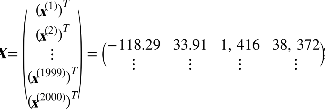 X是包含数据集中所有实例的所有特征值(不包含标签)的矩阵。每一行是一个实例,第i行是 $x^{(i)}$ 的转置,记为 $x^{(i)T}$。例如,仍然是前面提到的第一区,矩阵