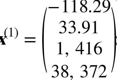 i个实例的所有特征值(不包含标签)的向量,$y^{(i)}$ 是它的标签(这个实例的输出值)。例如,如果数据集中的第一个街区位于经度 –118.29°,纬度 33.91°,有 1416 名居民,收入中位数是 $38372,房价中位数是 $156400(忽略掉其它的特征),则有: