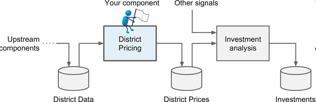 老板告诉你你的模型的输出(一个区的房价中位数)会传给另一个机器学习系统(见图 2-2),也有其它信号会传入后面的系统。这一整套系统可以确定某个区进行投资值不值。确定值不值得投资非常重要,它直接影响利润。