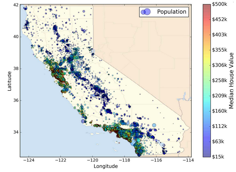 本章,我们选择的是 StatLib 的加州房产价格数据集(见图 2-1)。这个数据集是基于 1990 年加州普查的数据。数据已经有点老(1990 年还能买一个湾区不错的房子),但是它有许多优点,利于学习,所以假设这个数据为最近的。为了便于教学,我们添加了一个类别属性,并除去了一些。