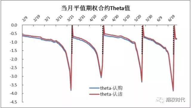上图为截止至上周五(6.26)上证50ETF当月平值期权的Theta值(来自wind数据),图中黑色竖直虚线表示当日为期权合约的到期日。总体而言,Theta绝对值随着期权到期日的临近而递增,且越接近到期日,Theta绝对值越大,在到期日Theta变为零。