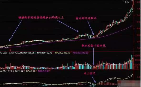 5日、10日和60日线图上,5/10日线不断上下起伏,形如龙躯。日K线依附在龙体上像龙鳞一般,持续周期可达半年之久,青龙取水后得到拉升的**,股价持续暴涨。