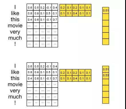 我们在句子矩阵和过滤器矩阵填入一些值,那么我们可以更好理解卷积计算过程,这和CNN原理那篇文章一样,