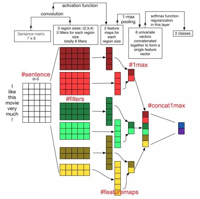 我们以上图为例,图上用红色标签标注了5部分,结合这5个标签,具体解释下整个过程的操作,来看看CNN如何解决文本分类问题的。