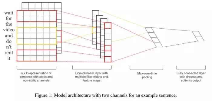 如图所示,输入层是句子中的词语对应的wordvector依次(从上到下)排列的矩阵,假设句子有 n 个词,vector的维数为 k ,那么这个矩阵就是 n × k 的(在CNN中可以看作一副高度为n、宽度为k的图像)。