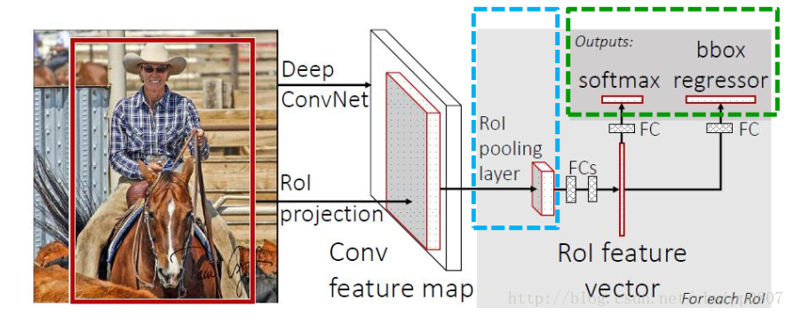 首先在SPP-Net与R-CCN一直使用的SVM分类器被换成了SoftMax,SPP-Net中的SPP换成了RoI pooling,多任务损失函数的引入整合了分类网络的损失函数与bounding box回归模型的损失函数,使任务不需要分阶段训练,区域建议依然使用ss算法生成,并在卷积后的特征图上提取(充分共享卷积计算),初始模型从AlexNet换成了VGG16。