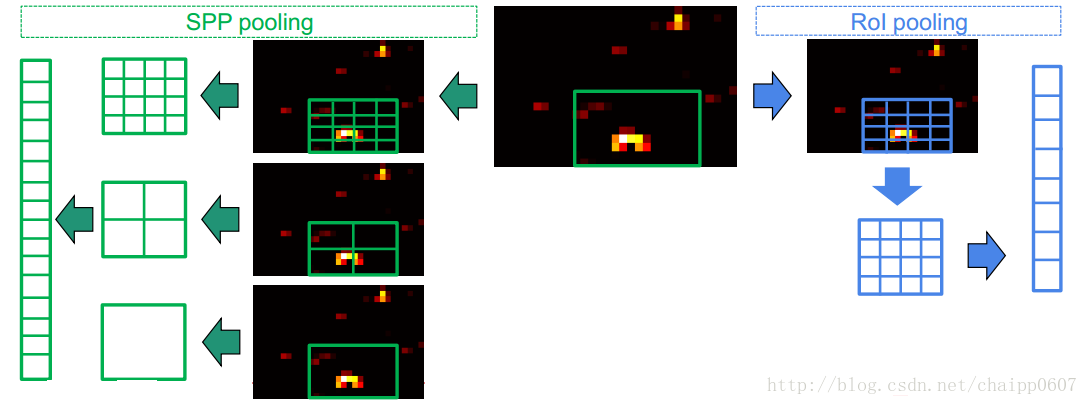 上面这张图说明了SPP与RoI pooling的区别,其实RoI pooling是SPP的一种简化,原本SPP是一种多尺度的池化操作,最后将三个尺度的特征做串接作为全连接层的输入,而RoI pooling只选择了其中一种尺度,将ss算法的建议框做坐标变化后的尺寸的长和宽,平均分为w份和h份,在每一份中使用最大池化,最后产生w*h个bin,这样做有下面几个好处: