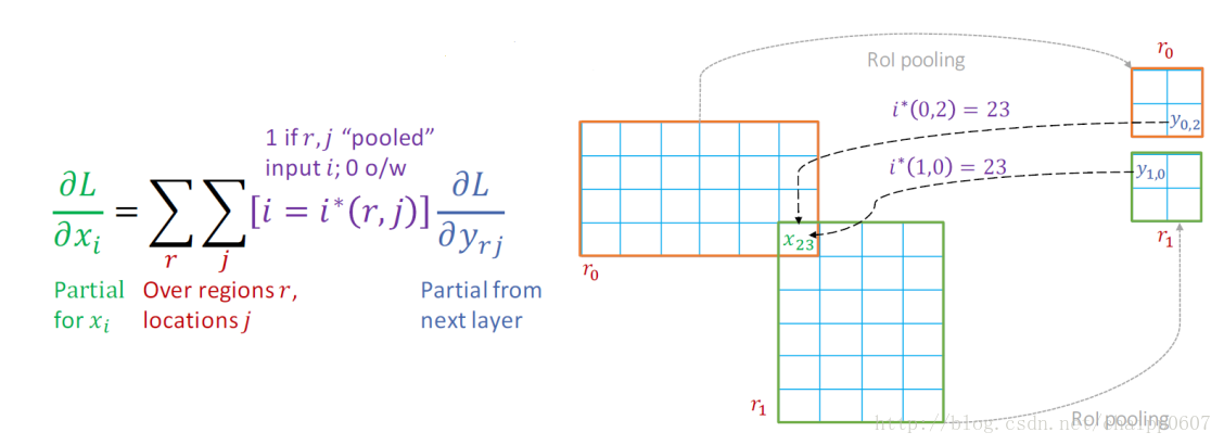 上图中有r0与r1两个区域,每个区域都通过RoI pooling之后生成4个bin,x23的意思是第23个像素,那么计算x23位置的梯度就可以根据上图中左侧的公式,其中r是包含有这一点的区域,j是某个区域内的所有位置。