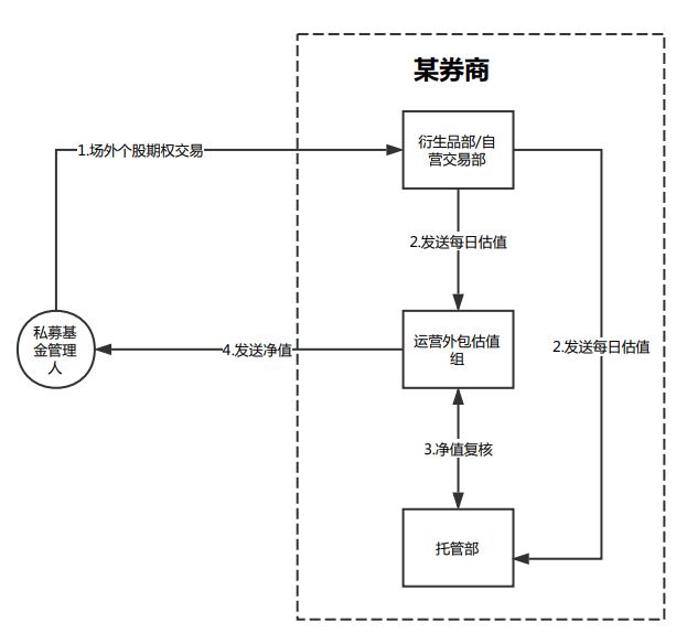 一般来说,私募管理人会同一家证券公司的自营交易部门做场外个股期权的交易。由于目前国内很少有**第三方基金外包服务机构,这家私募管理人极有可能会选同一家证券公司作为产品的托管人和行政服务商。然后,对于场外期权的估值流程就变成了下图的样子: