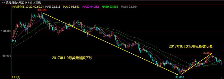 此外,绝大多数交易者都比较关注美元指数,他们基本上认为,美元指数走强,大宗商品就走弱;美元指数走弱,大宗商品也走强。当然,投资者存在这样的误解也是很正常的,毕竟一方面学校里就是这么教的,另一方面专家也是这么解释的。事实真的是这样吗?我们看一下美元指数的走势图,2017年1-9月美元指数下跌,9月之后美元指数开始弱势反弹。