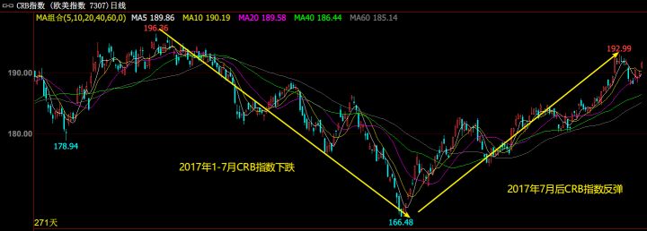 让我们再来看一下CRB指数,在2017年1-7月份CRB指数下跌,7月份之后CRB指数还是反弹。