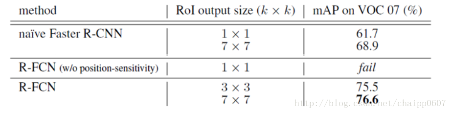 R-FCN RoI pooling的k选择为1时是没有位置敏感信息的,直接fail,k选择为3和7时,mAP分别为75.5%与76.6%。