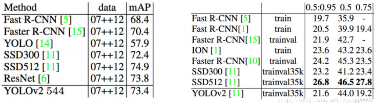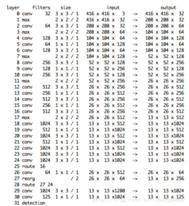 从上面的图我们可以看到YOLO 2有32层。结构还是比较常规的,主要就是在用3*3的卷积,2*2的池化和1*1的卷积。除了上面三个常规操作外,还有reorg和route,其中route在25层和28层,reorg在27层。
